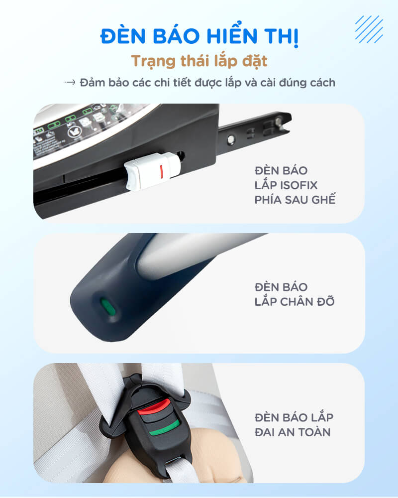 - Đèn báo hiển thị trạng thái lắp đặt, đảm bảo lắp và cài đúng cách