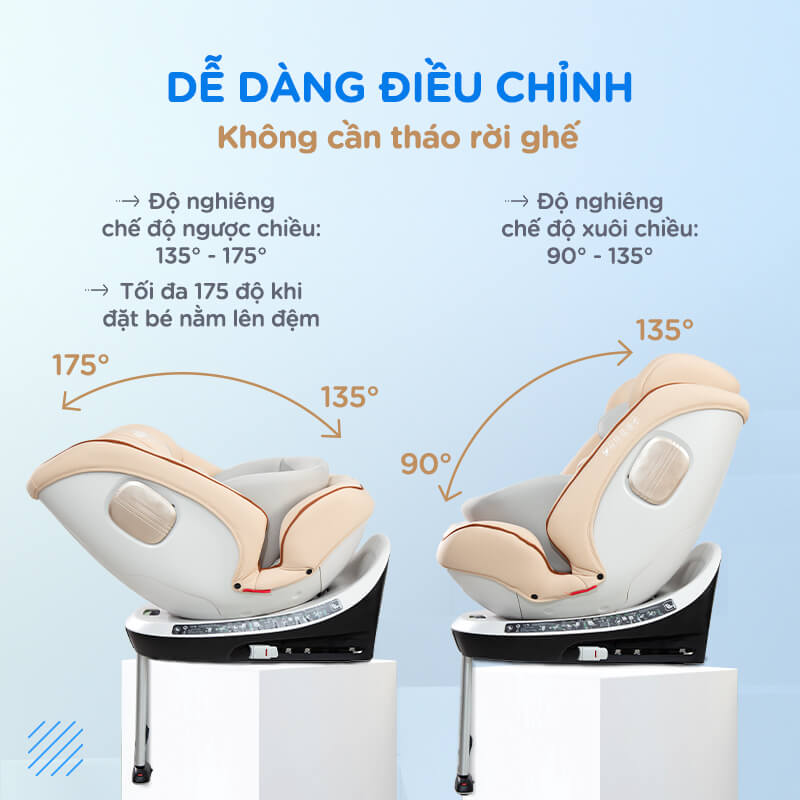 - Điều chỉnh độ nghiêng tựa lưng 2 chiều: Xuôi chiều (90° – 135°); Ngược chiều (135° – 175°)
