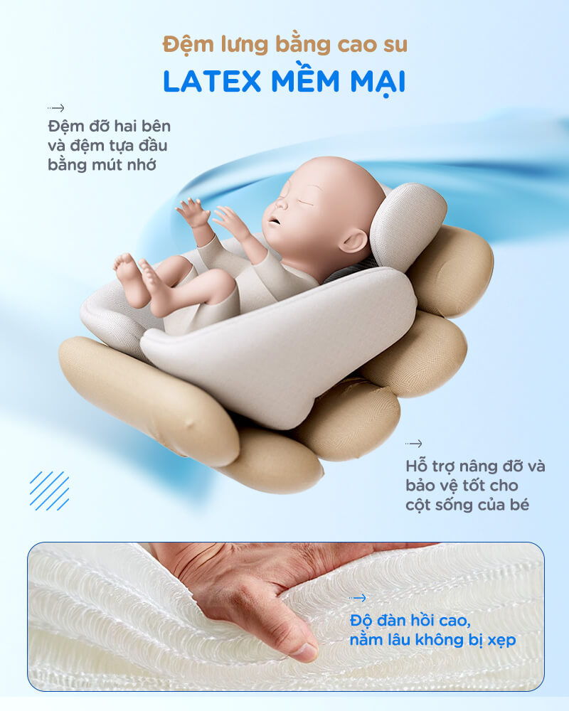 - Đệm lưng: Cao su latex, bỏ bọc cationic